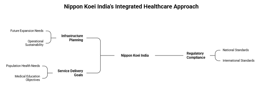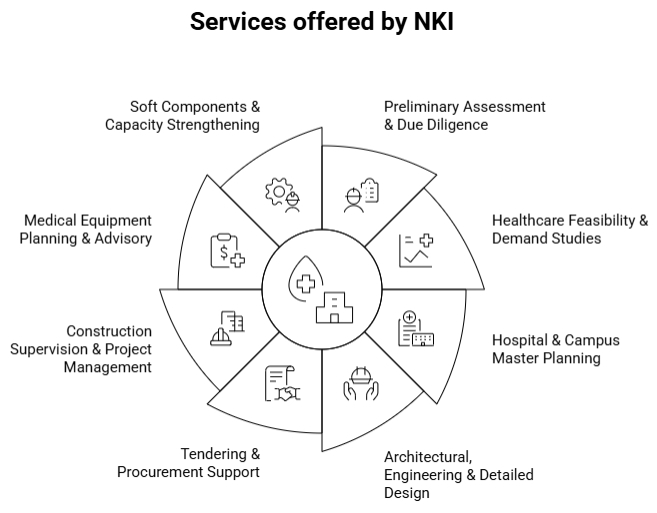 Nippon Koei India Pvt. Ltd. (NKI) views healthcare as an integrated system that requires collaboration between infrastructure, engineering, technology, and human capability. As a member of the ID&E Group, NKI leverages decades of global experience to assist healthcare organizations in creating facilities that are operational, compliant, and flexible throughout their whole lifecycle. Our work focuses on coordinating infrastructure planning with future expansion needs, regulatory requirements, and service delivery goals.